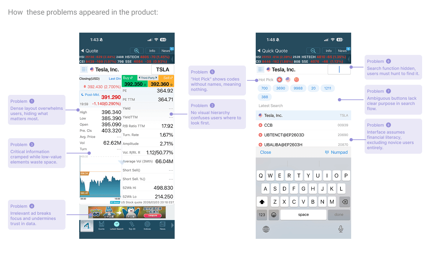 The information we displayed on the quote page was unstructured and lack of visual hierarchy. Users cannot build financial literacy within the app. They remain dependent on external sources and never progress from passive viewers to confident decision-makers.