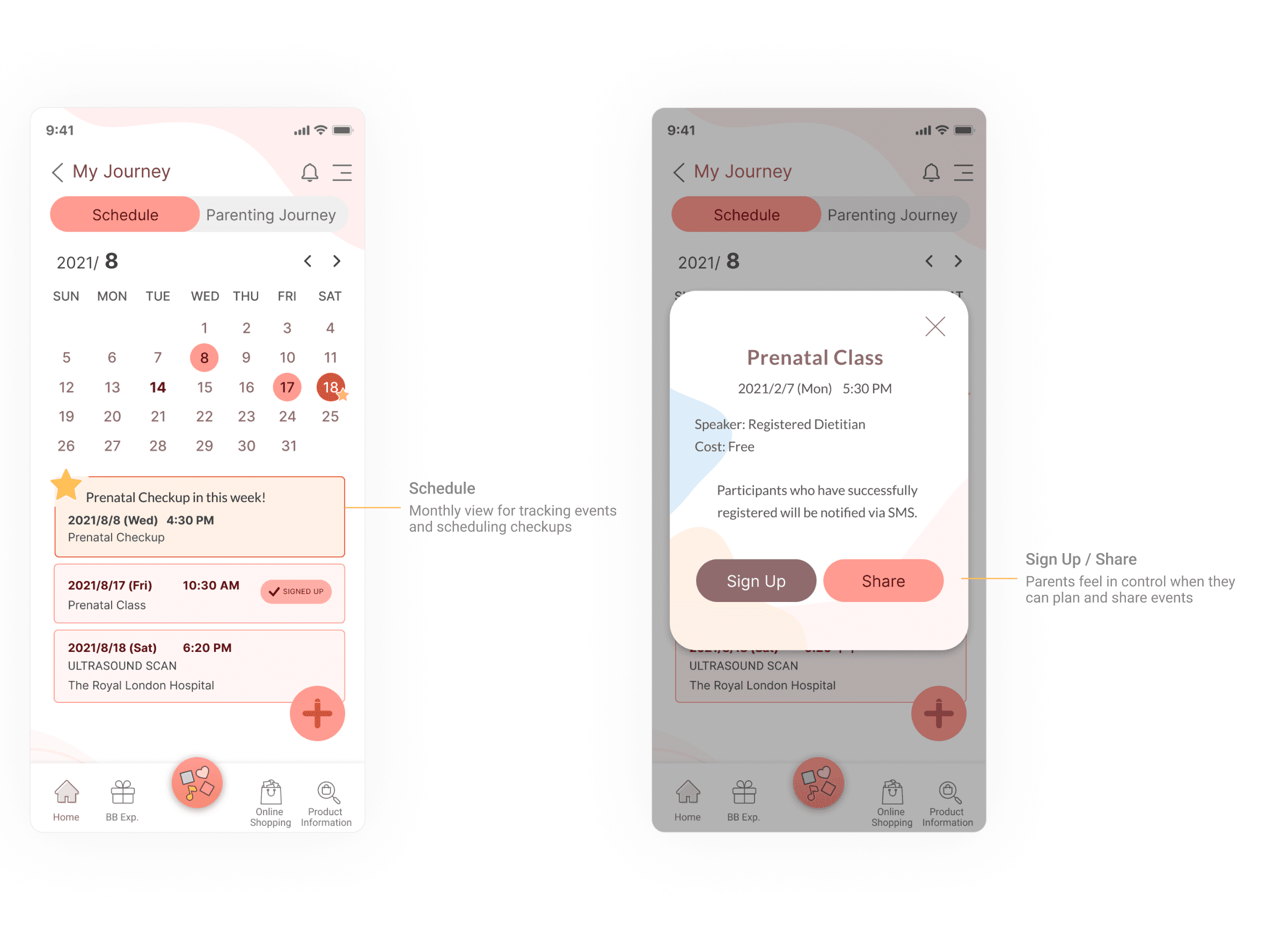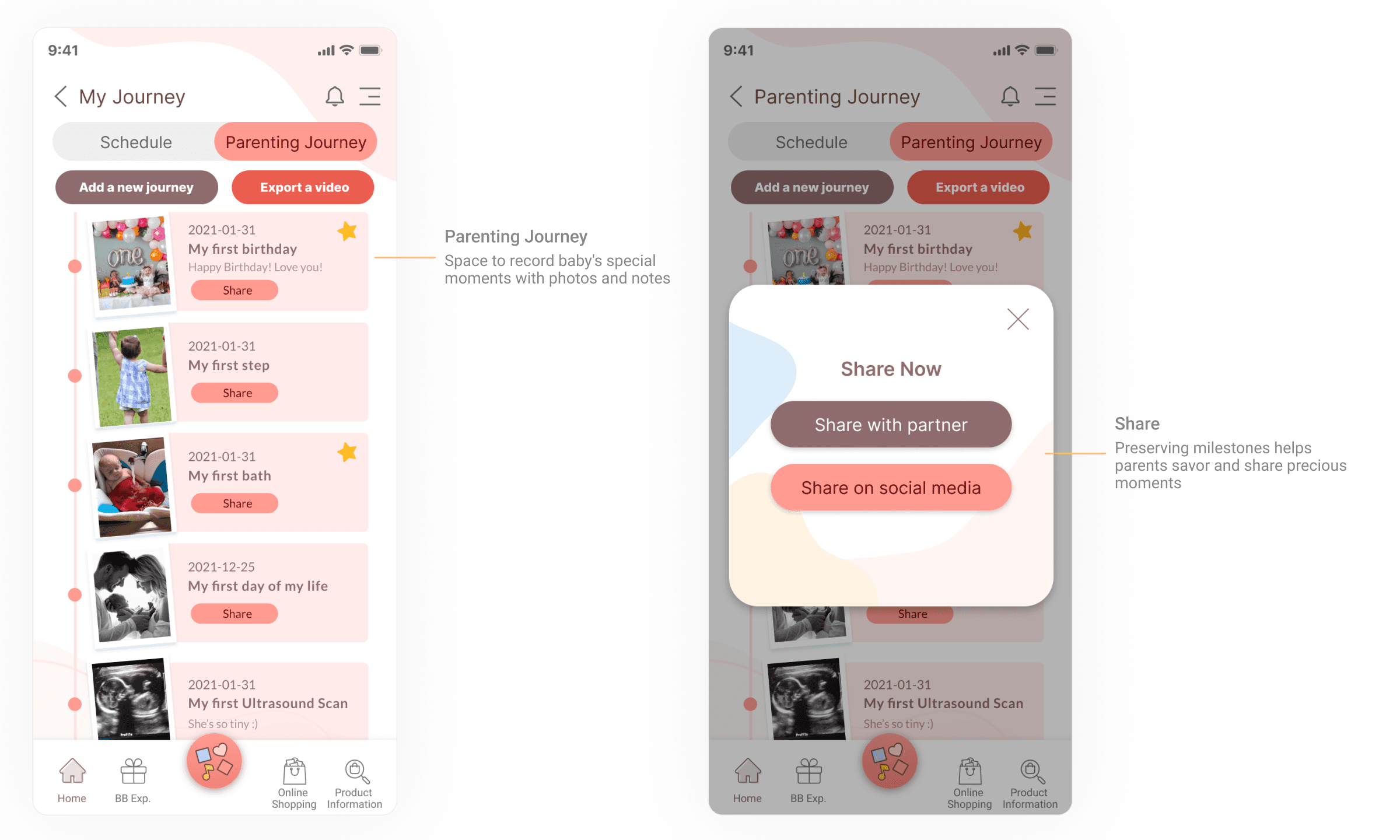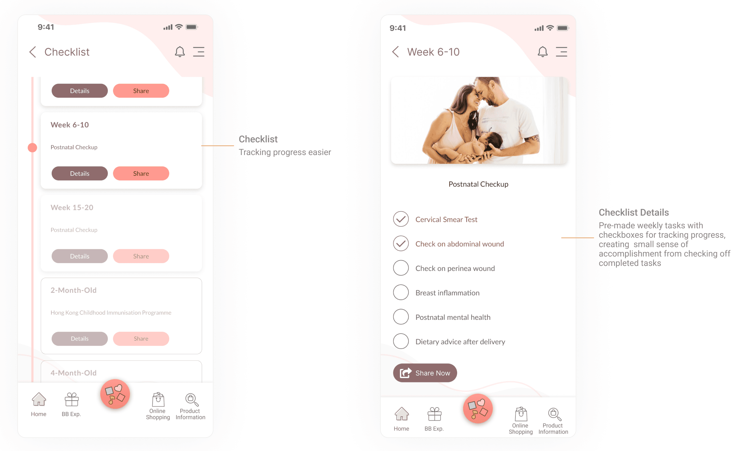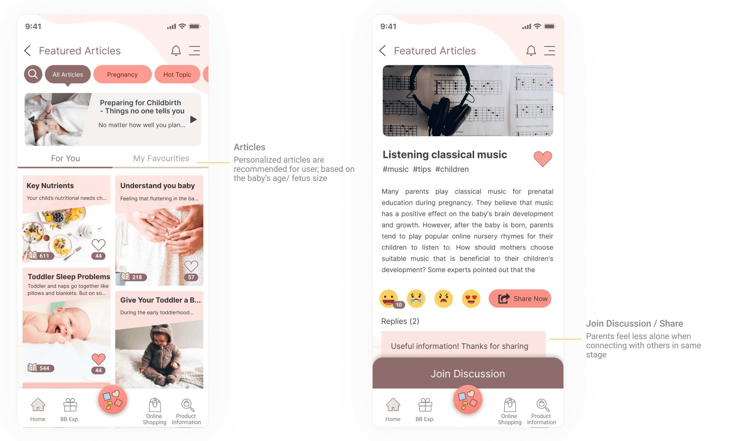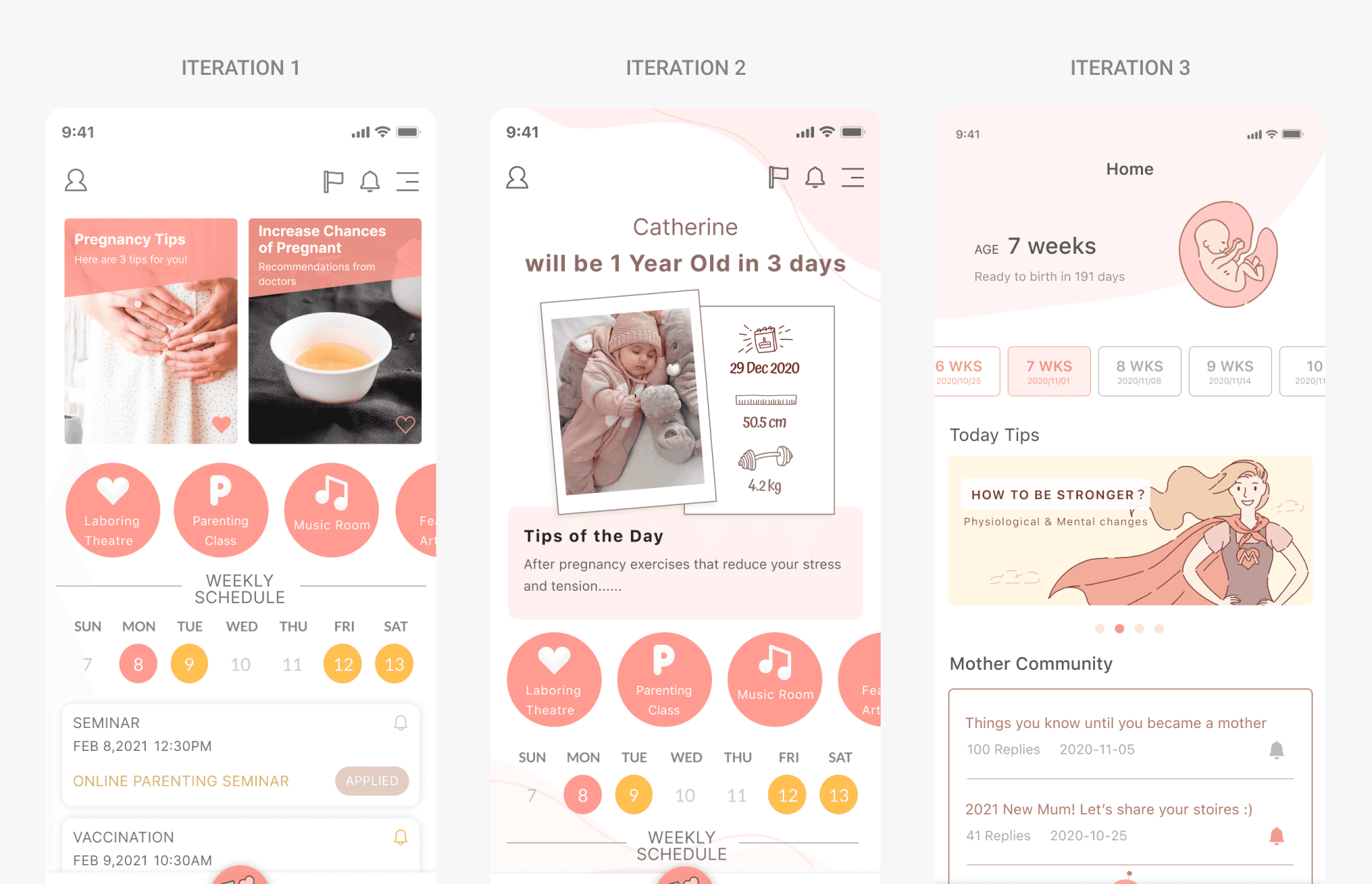 Before the project started, we have already received user data from clients so we designed feature based on our assumptions and use data to inform design iteration. Then we made simple questionnaires and interviews with potential users to understand more about their basic needs or concerns during their parenting journey and helping us to define which features is suitable for the final deliverables.