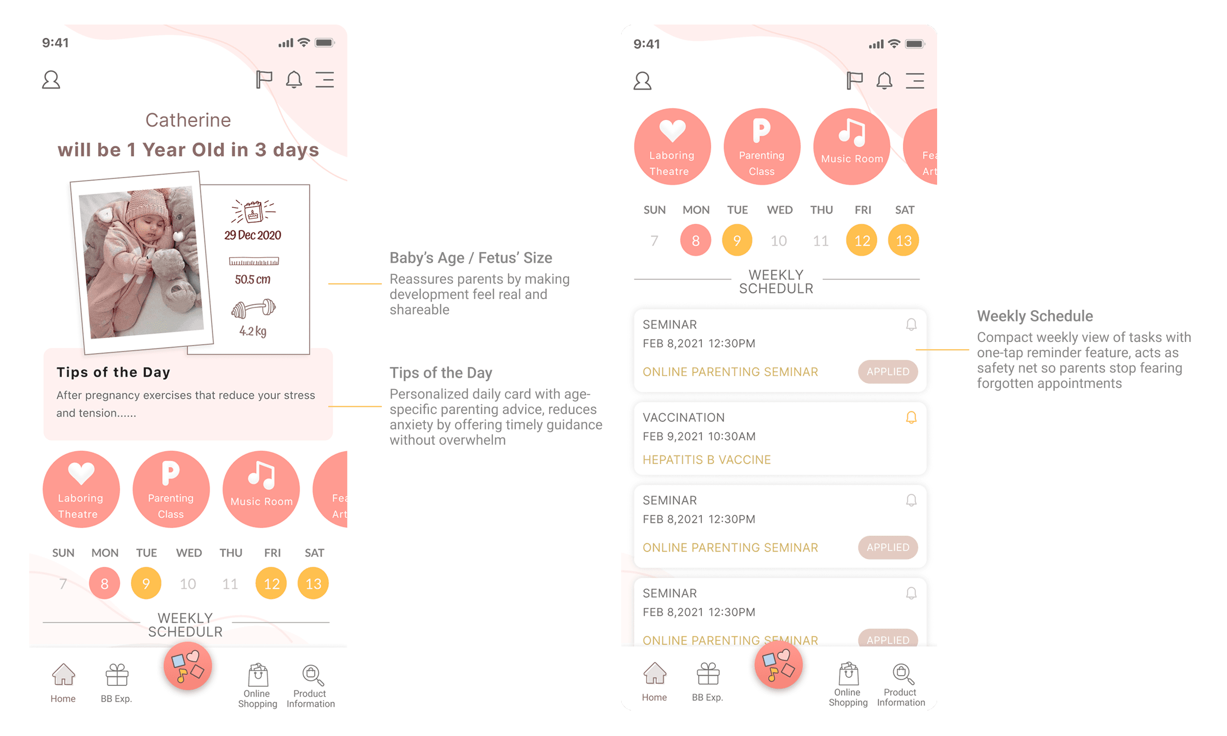 The internet is full of parenting advice—but not all of it is trustworthy. We partnered with doctors and authorized experts to curate a library of articles and video classes that new parents can actually rely on. We designed the articles section with clear visual hierarchies: expert badges, video thumbnails, and categorized tags so parents can immediately identify credible content. From labor preparation to newborn care and checkup precautions, every piece of content is vetted and practical. Our goal is to replace confusion with clarity, giving parents a trusted go-to source for learning at their own pace.